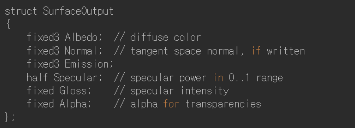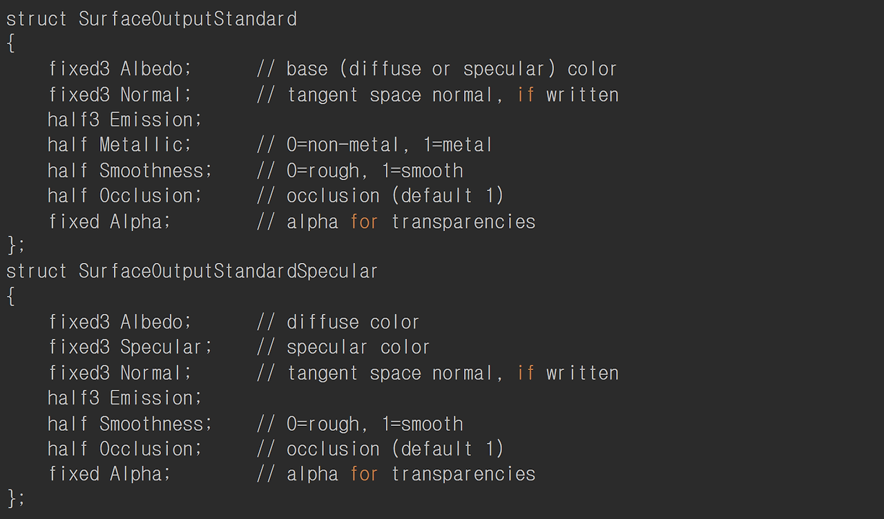 - SurfaceOuputStandard / SurfaceOutputStandardSpecular 구조체