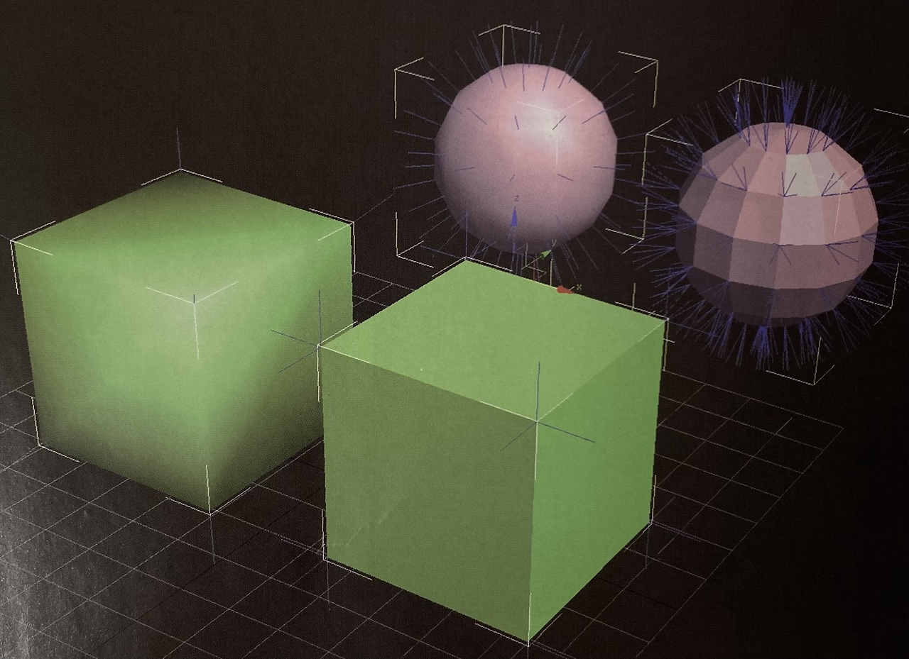 다만, 각진 형태(Hard Edge)를 표현하기 위해서는 아래와 같이 한 버텍스에 노멀이 3개 혹은 모양에 따라 4개가 있어야 한다.