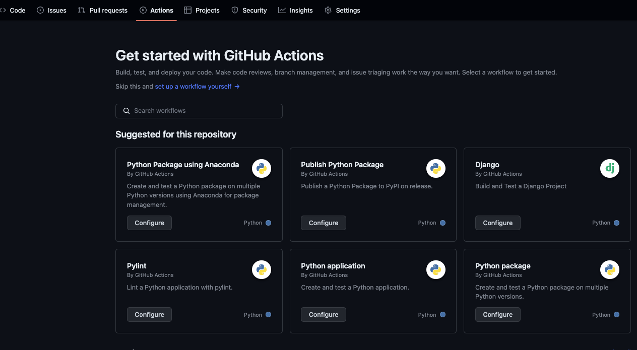 CI/CD를 구축하고 싶은 Repository로 이동하여 Actions 탭을 누르면 다음과 같은 화면이 보입니다. 여기서 원하는 템플릿을 가져다 쓰면 됩니다!