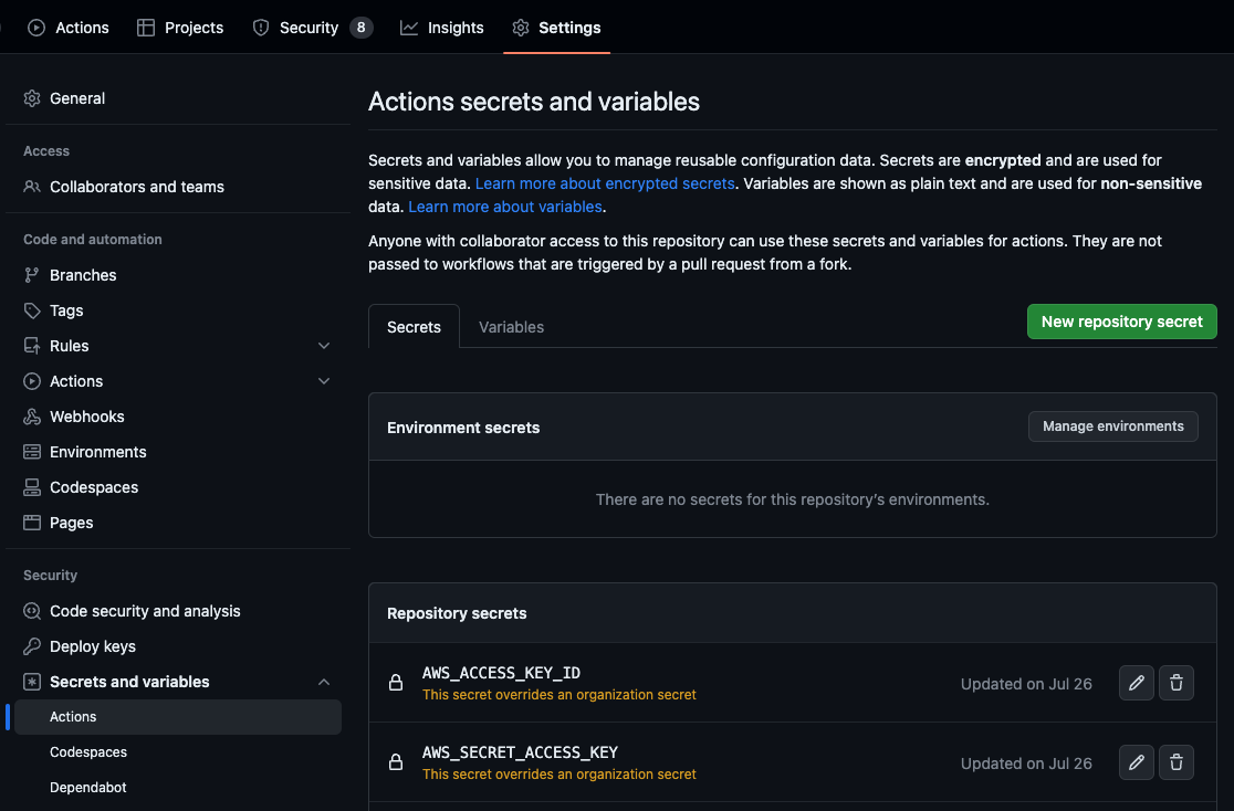 Name에는 직접 입력한 환경변수의 Key 값을 입력하여 사용할 수 있습니다.- name: Configure AWS Credentials uses: aws-actions/configure-aws-credentials@v1 with: aws-access-key-id: ${{ secrets.AWS_ACCESS_KEY_ID }} aws-secret-access-key: ${{ secrets.AWS_SECRET_ACCESS_KEY }} aws-region: ap-northeast-2