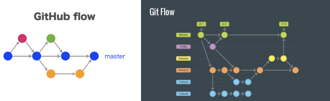 Git Flow, Github Flow, GitLab Flow 등 이 외에도 다양하지만 주로 널리 사용디는 Git Flow와 Github Flow를 기준으로 설명드리겠습니다.